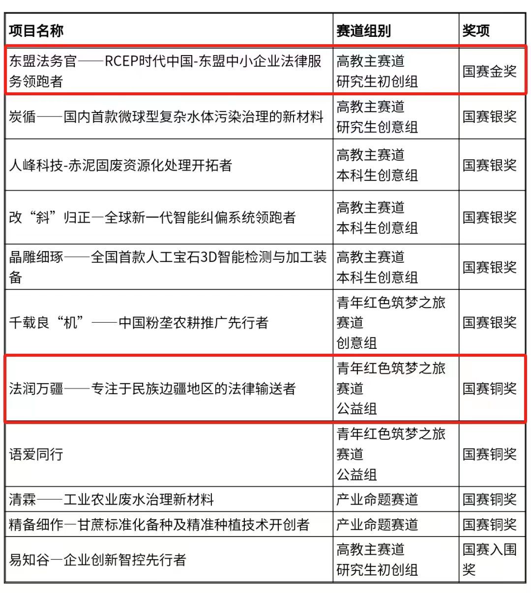 法学院“法润万疆——专注于民族边疆地区的法律输送者”项目,在本届中国国际大学生创新大赛中荣获青年筑梦之旅赛道公益组铜奖。