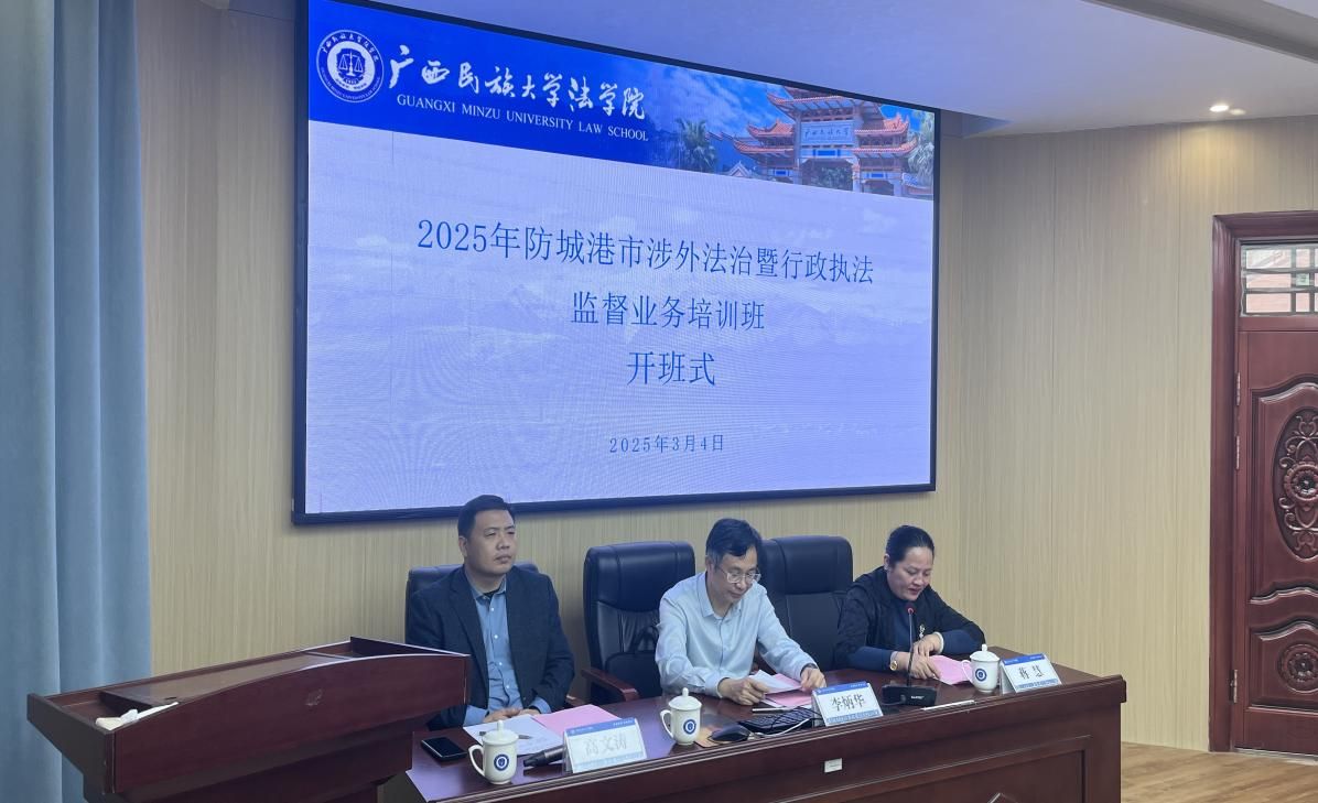 为提升防城港市涉外法治建设与行政执法规范化水平,强化涉外执法协作与行政监督效能,进一步增强防城港市行政执法人员业务能力,打造高素质、专业化的涉外法治工作队伍,2025年3月4日至3月7日,2025年防城港市涉外法治暨行政执法监督业务培训班于广西民族大学相思湖校区知行楼诗予学堂举办, 防城港市司法局局长李炳华,广西民族大学法学院党委书记蒋慧、副书记高文涛参加开班式。