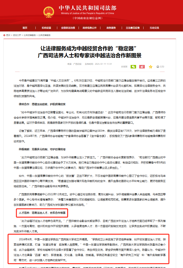 【简讯】2025年7月11日,司法部网站刊文:《让法律服务成为中越经贸合作的“稳定器”广西司法界人士和专家谈中越法治合作新图景》,其中报道了best365涉外法治人才培养的做法。