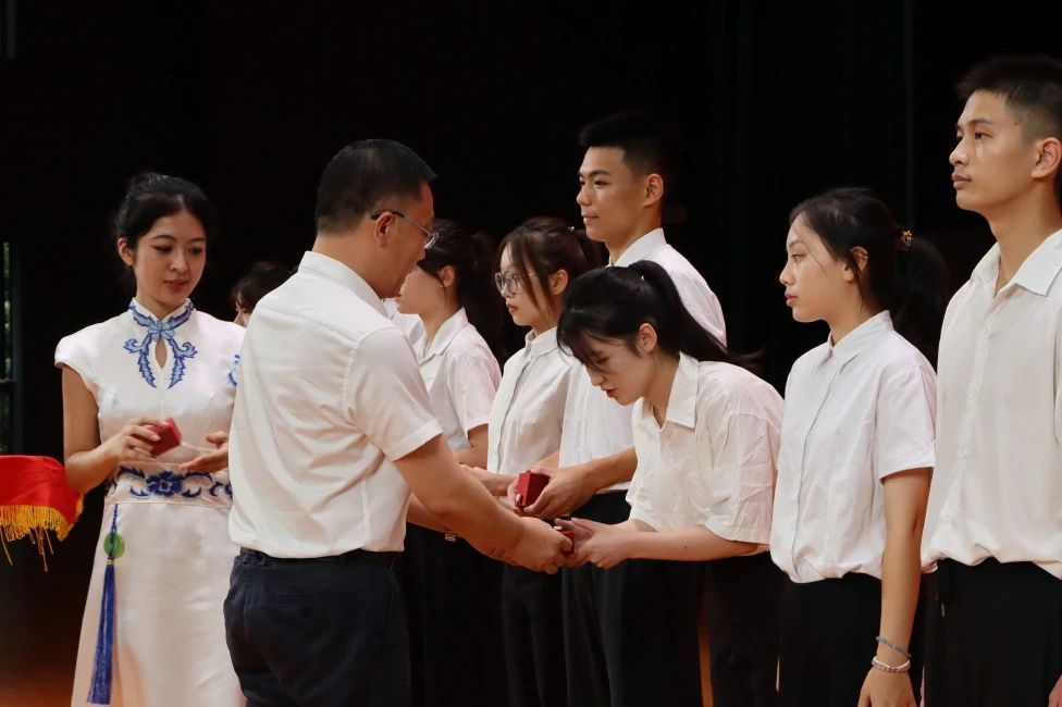 学院党委书记黄中显为2024级新生代表佩戴院徽并送上美好祝福。