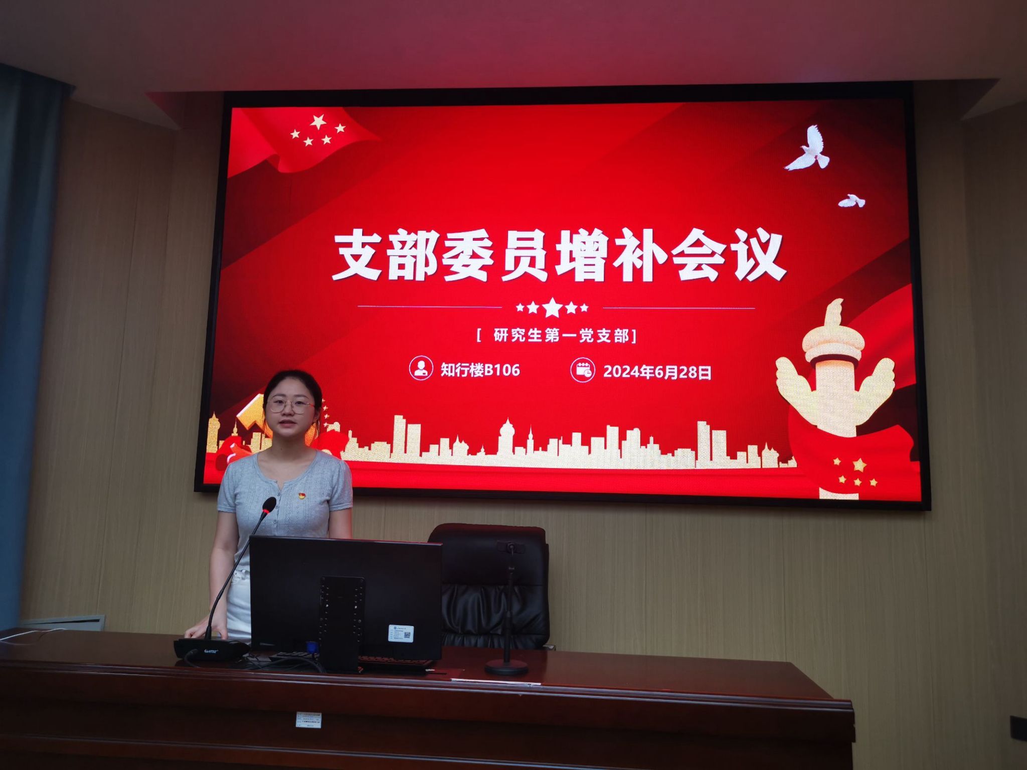 为进一步加强党组织建设, 2024年6月28日下午,法学院研究生第一党支部在知行楼B106召开党员大会。大会主要议题为增补党支部委员会委员和预备党员转正。会议由党支部书记秦莉佳老师主持,支部全体党员参加了会议。